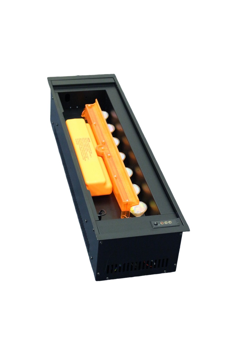 Очаг Cassette с эффектом живого пламени и дыма. Вместо дров установлена минималистичная чёрная пластина из которой «горит огонь». Рекомендуется для установки в подходящие порталы, ниши, дизайнерские конструкции. Подходит для установки в неиспользуемые дровяные камины. Работает на воде. Увлажняет воздух. Интенсивность дыма регулируется. Есть пульт ДУ. Функции обогрева нет.