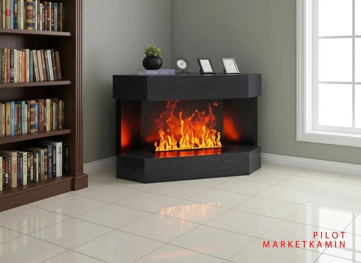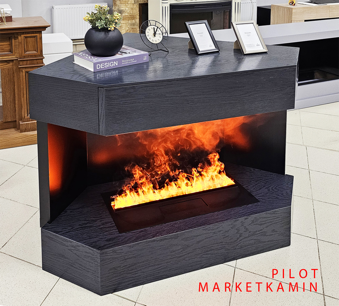 PILOT (Пайлот Дуб Антрацит 1200) угловой с выдвижным ящиком. Новый очаг 3D HOT LINE с живым пламенем. Габариты (ШxВxГ): 1200х900х750х катеты 840 мм