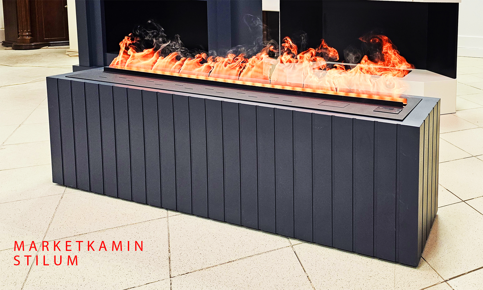 Широкий очаг с линией огня 120 см, работающий на воде, с эффектом живого пламени и дыма 3D. Увлажняет воздух. Интенсивность дыма регулируется. Есть пульт ДУ. Без функции обогрева.